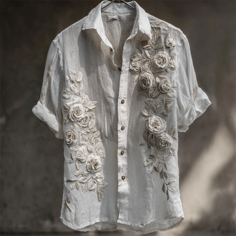 Vintage Classy White Roses Fiber Art Flowy Linen Shirt