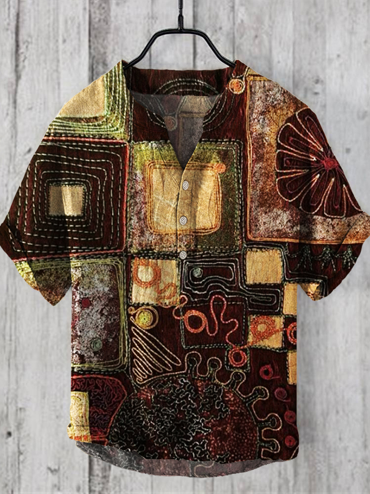 Vintage Patchwork Fabric Embroidered Art Men's Linen V-neck Shirt