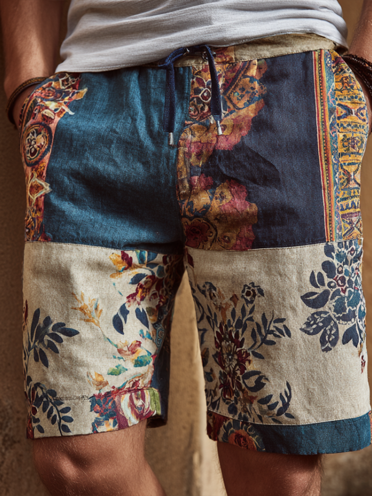 Western Bohemian Style Plant And Flower Pattern Retro Cotton And Linen Loose Men's Shorts