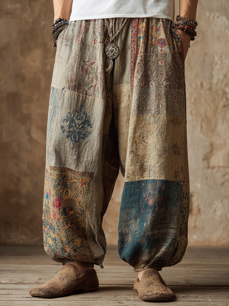 Western Bohemian Style Plant And Flower Pattern Retro Cotton And Linen Loose Wide-leg Pants