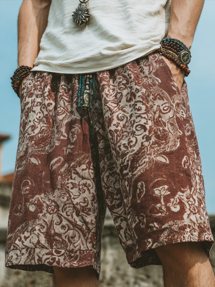 Western Bohemian Style Plant And Flower Pattern Retro Cotton And Linen Loose Wide-leg Shorts