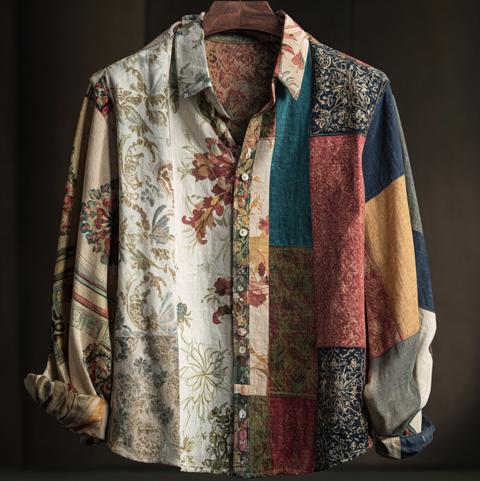 Western Style Bohemian Plant Flower Pattern Color Block Patchwork Retro Cotton And Linen Men's Shirt
