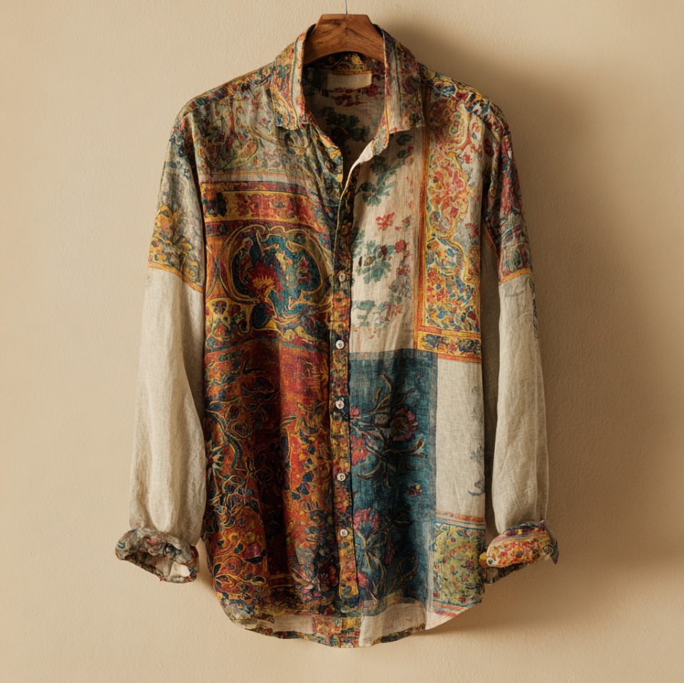 Western Style Bohemian Plant Flower Pattern Color Block Patchwork Retro Cotton And Linen Men's Shirt