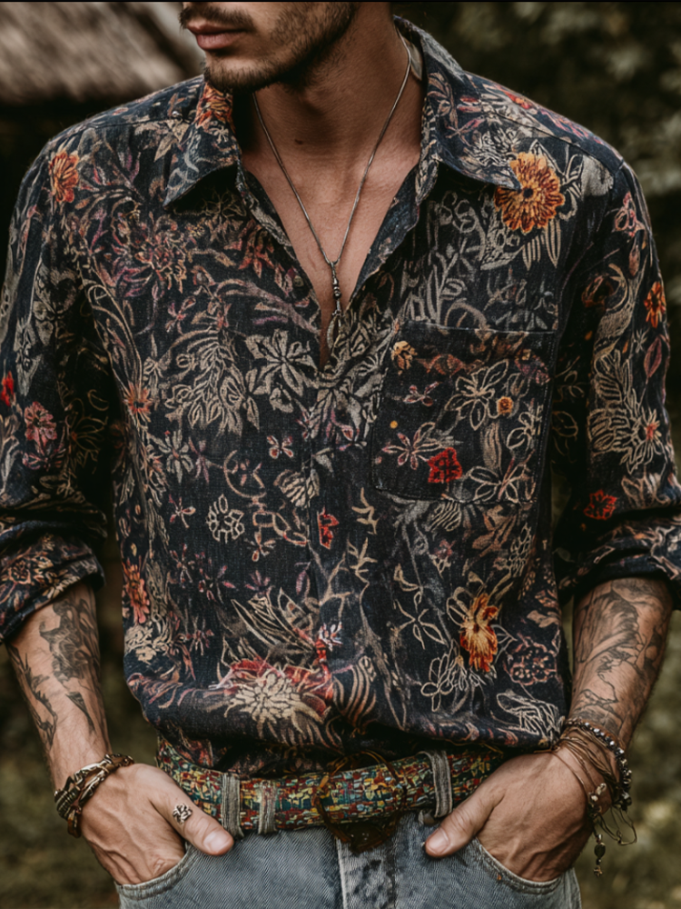 Western Style Bohemian Plant Flower Pattern Color Block Patchwork Retro Cotton And Linen Men's Shirt