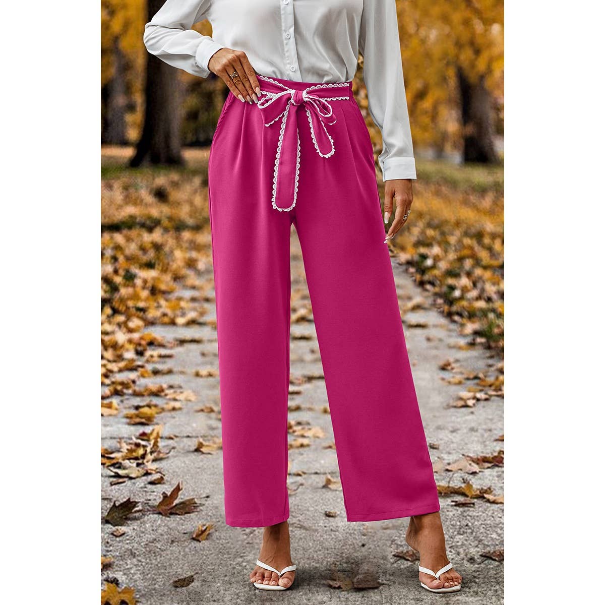 Straight Leg Elastic High Waist Lace Tie Trim Pants