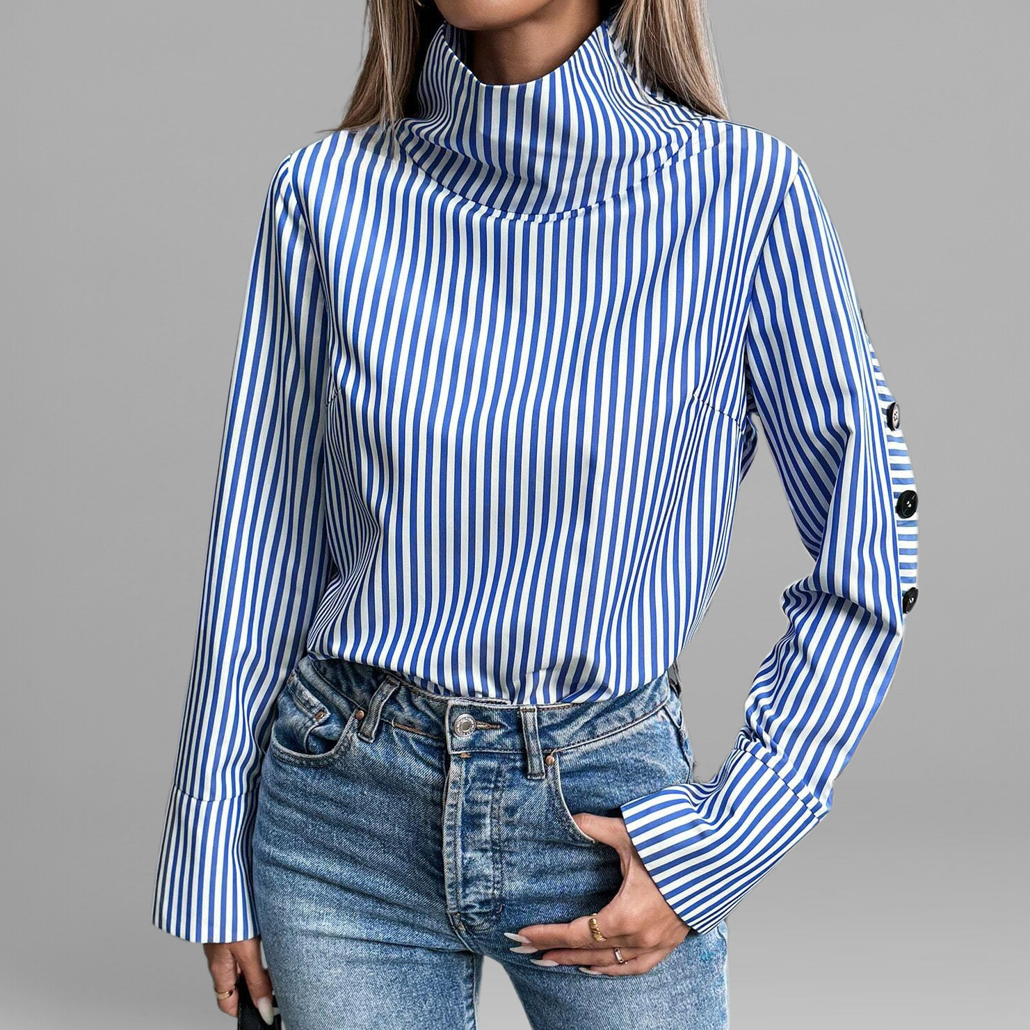 Women's Blue Striped High Neck Side Black Button Long Sleeve Blouse