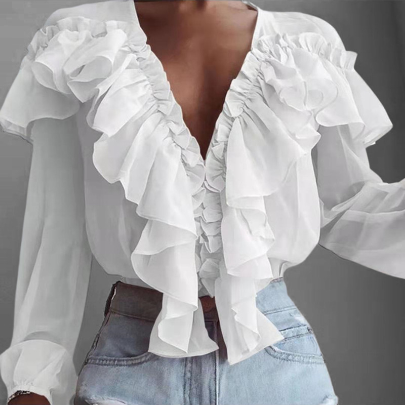Women's Chiffon Layered Ruffles Deep V Neck Long Sleeve Blouse