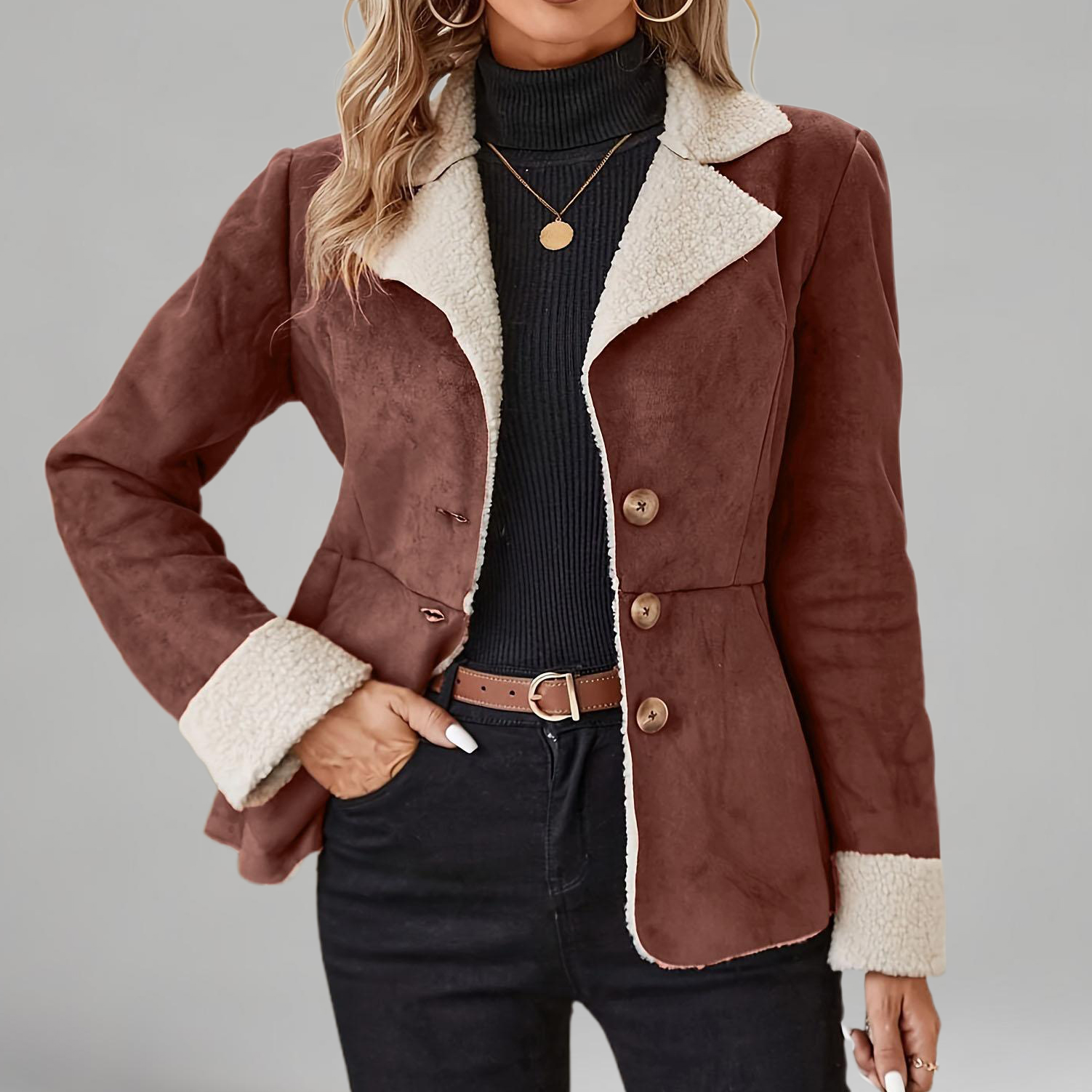 Women's Coffee Notched Lapel Long Sleeve Three Button Fleece-Lined Tunic Coat
