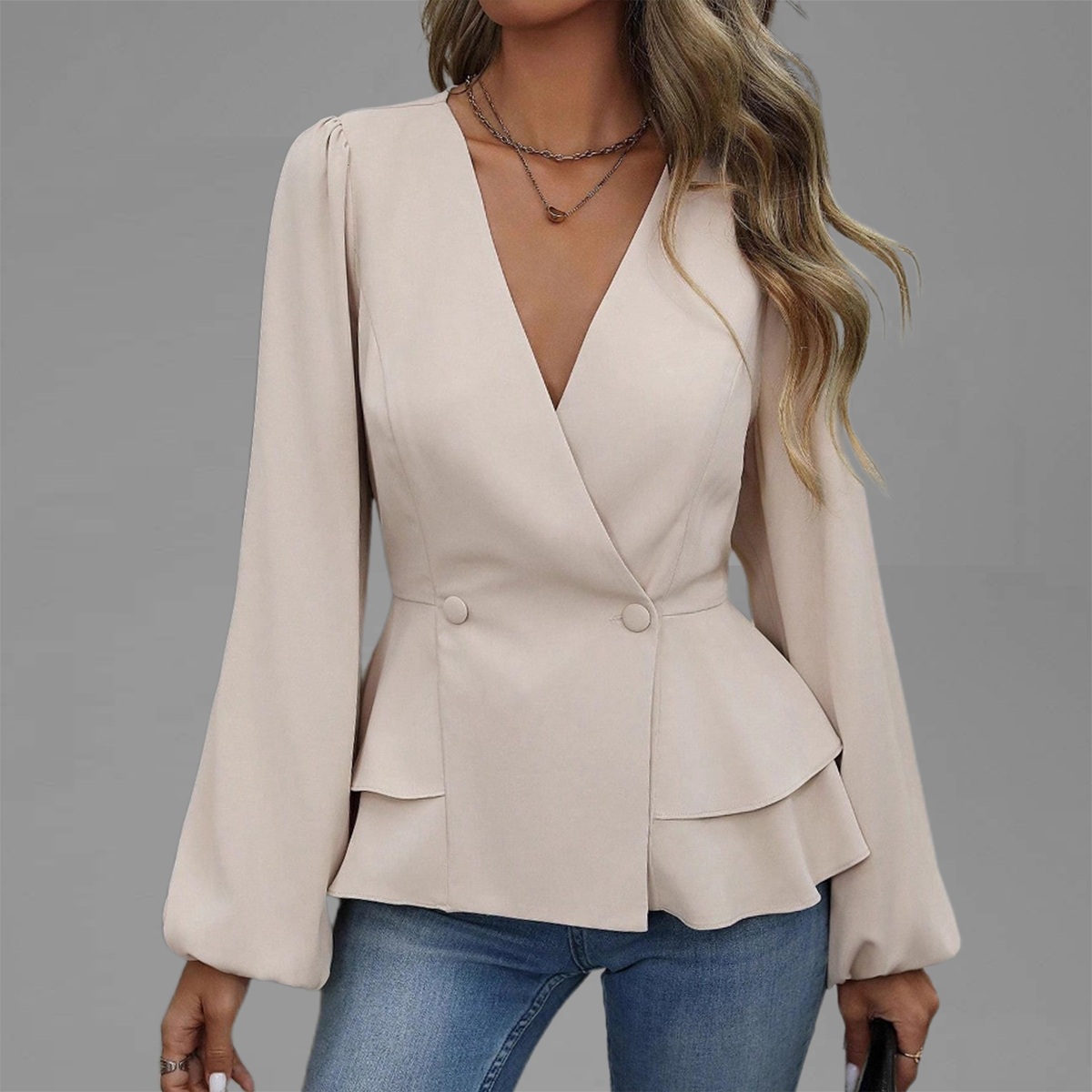 Women's Elegant Wrap V Neck Double Breasted Lantern Seeve Peplum Blouse