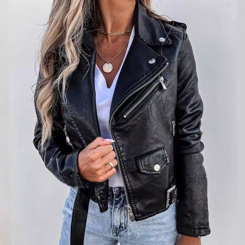 Women's Fashion Lapel Collar Long Sleeve Zipper Pocket Belt PU Leather Biker Jacket