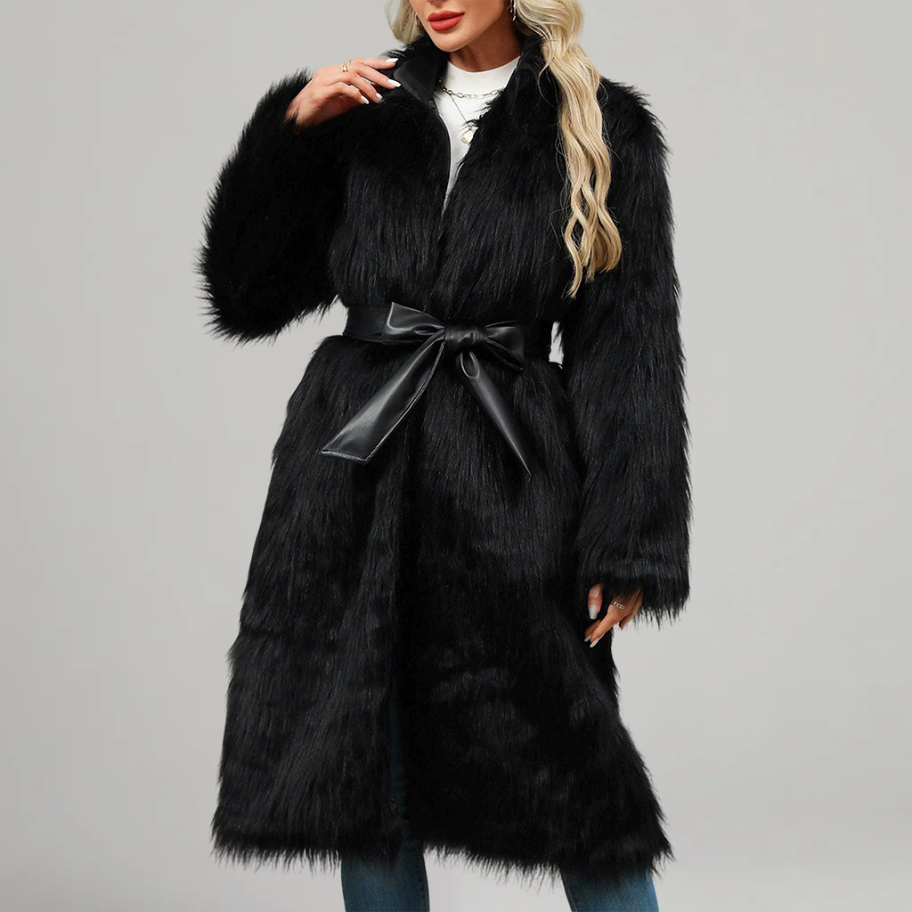 Women's Fashion Stand-Up Collar Long Sleeve Belted Thickened Fuzzy Overcoat