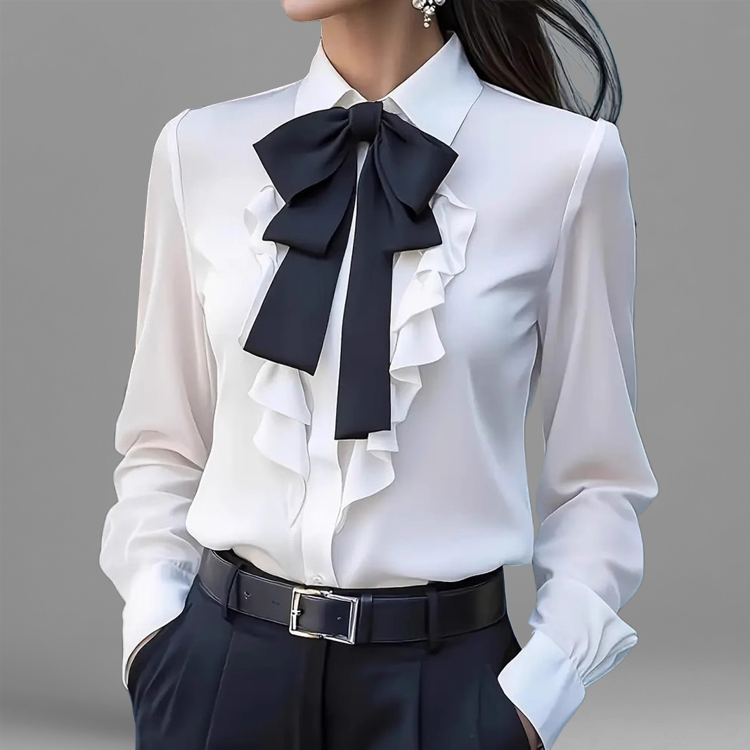 Women's Formal Shirt Collar Bow Tie Ruffles Long Sleeve Blouse