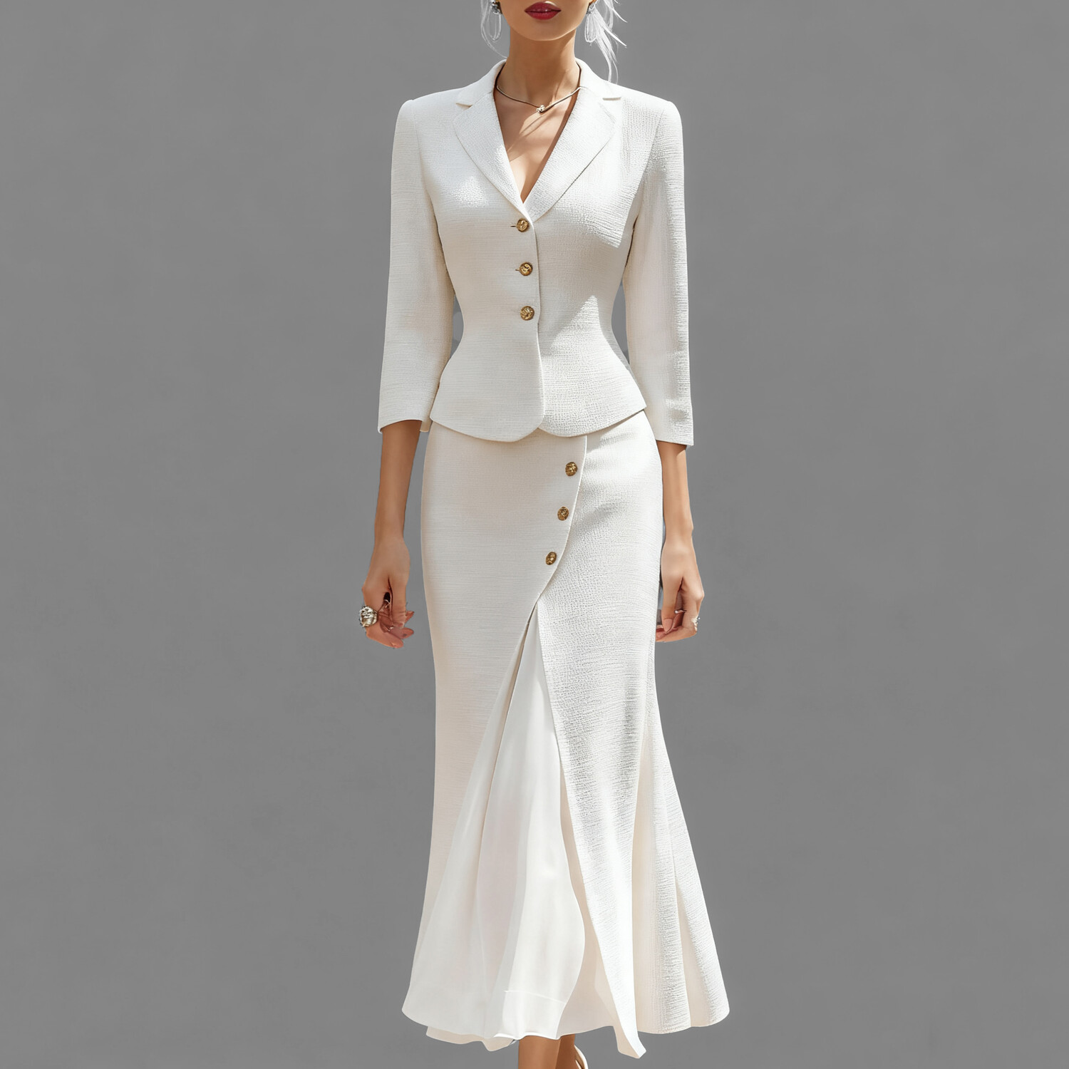 Women's Formal White Notch Lapel Buttons 3/4 Sleeve Blazer & Mermaid Midi Skirt 2Pcs Set