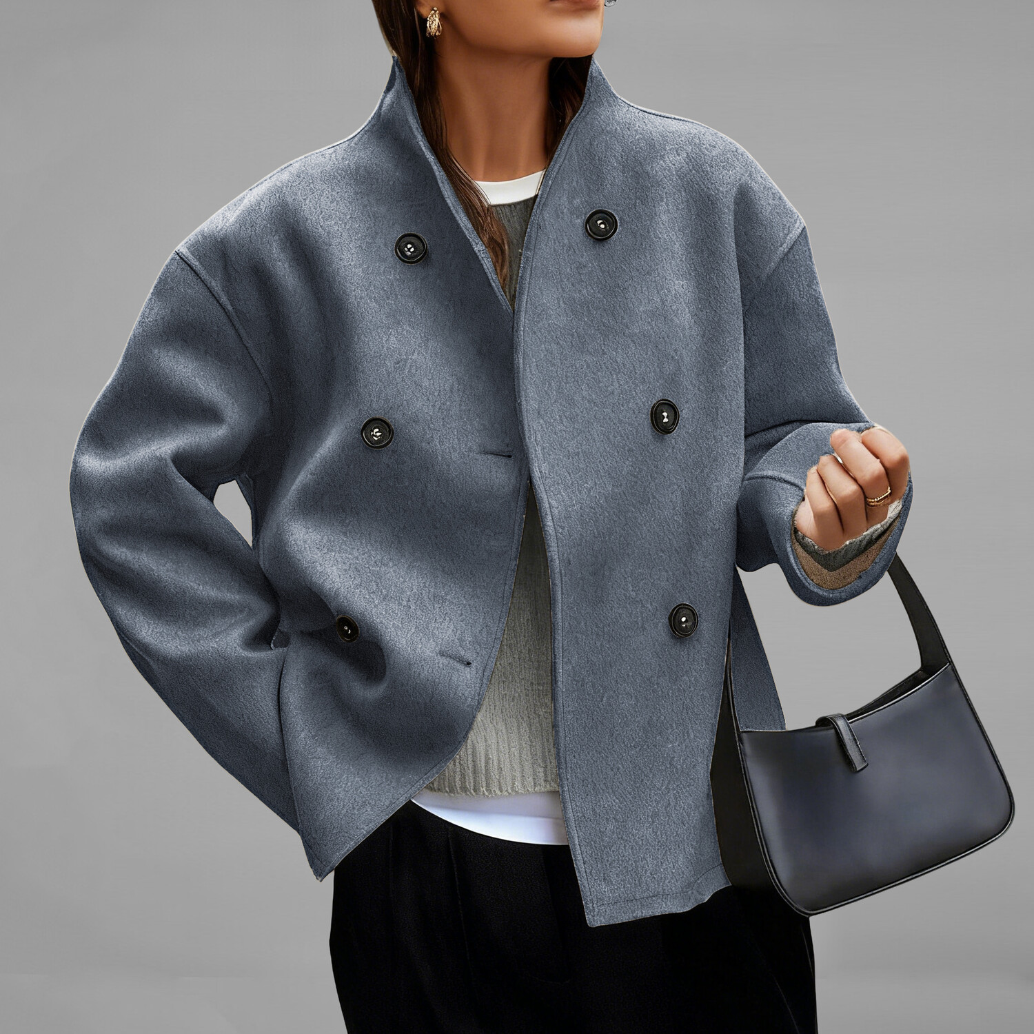 Women's Gray Solid Color Stand Colllar Double Breasted Long Sleeve Wool Blend Coat