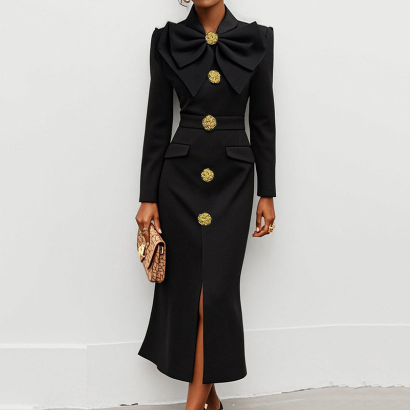 Women's Large Bow Gold Buttons Stand Collar Long Sleeve Front Slit Tunic Midi Dress