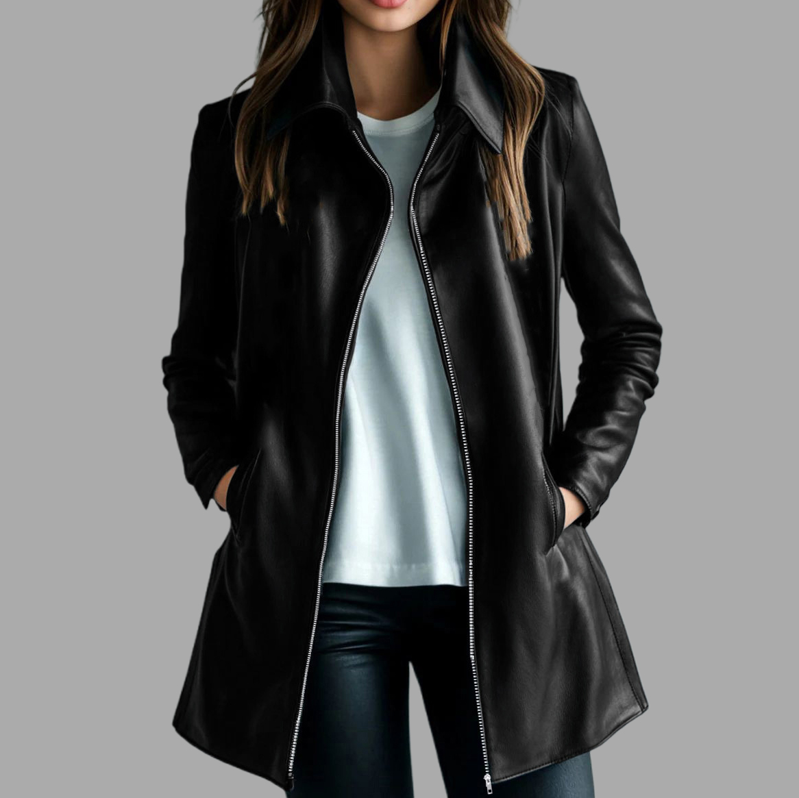 Women's PU Leather Turndown Collar Long Sleeve Zipper Pockets Mid-Length Jacket