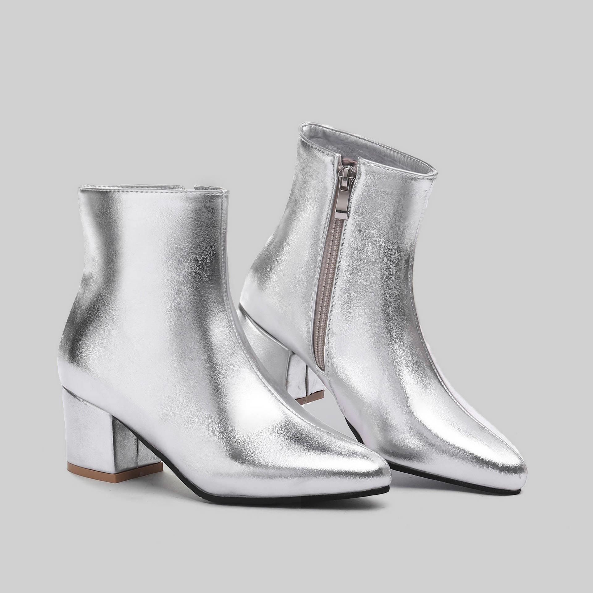 Women's Silver PU Leather Pointed Toe Chunky Heel Side Zipper Ankle Boots